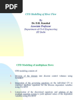 This document discusses the use of computational fluid dynamics (CFD) modeling to simulate river flows and multiphase flows. It describes the key approaches to CFD modeling including Eulerian, mixture model, discrete phase model, and volume of fluid methods. Examples of CFD simulations of river meander patterns, sediment transport, slurry pipelines, and hydraulic structures are mentioned. The goal of CFD river modeling is to better understand floodplain flows and inform flood protection strategies.