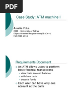 The document provides requirements and design details for an ATM system. It describes the key functions of an ATM including authenticating users, allowing them to view balances, withdraw cash, and deposit funds. It includes use case and class diagrams to model the system. The use case diagram shows the ATM user actor and main use cases. The class diagram identifies important classes like ATM, Account, and Transaction, and shows their attributes and relationships.