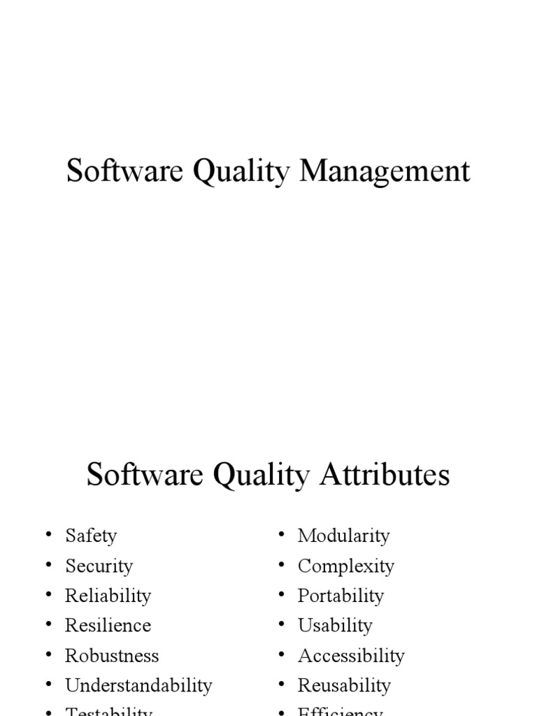 The document discusses software quality management and describes various quality attributes, control approaches, and review types used to ensure high quality software. It also covers software metrics and measurement, explaining how they are used to quantify and predict attributes to help control the software process and make management decisions. Both static and dynamic metrics are examined, as well as how measurement data is collected, analyzed, and can sometimes lead to unexpected insights.
