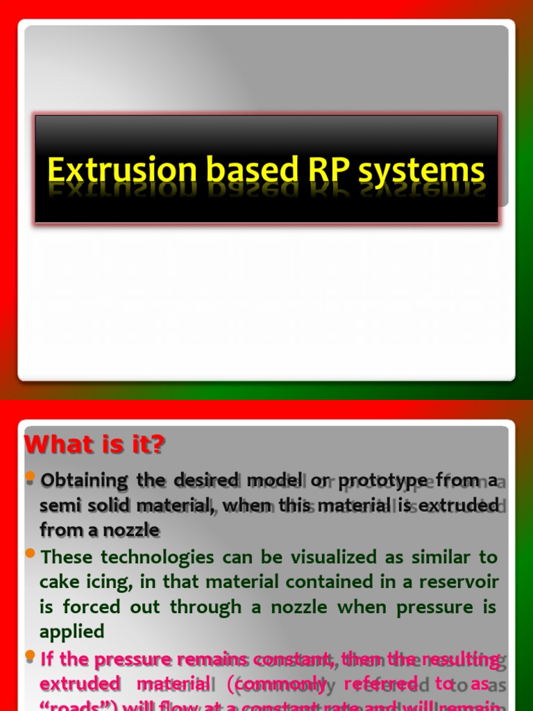 Extrusion-based rapid prototyping systems work by extruding semi-solid materials through a nozzle to build 3D objects layer by layer. Fused deposition modeling (FDM) is a commonly used extrusion technique that uses thermoplastic materials which are liquefied and extruded to bond with each other. The FDM process involves slicing a 3D CAD model, extruding the material according to the slices, and allowing the material to solidify to build a solid object layer by layer. FDM can be used to create concept models, functional prototypes, investment casting patterns, and some medical applications.