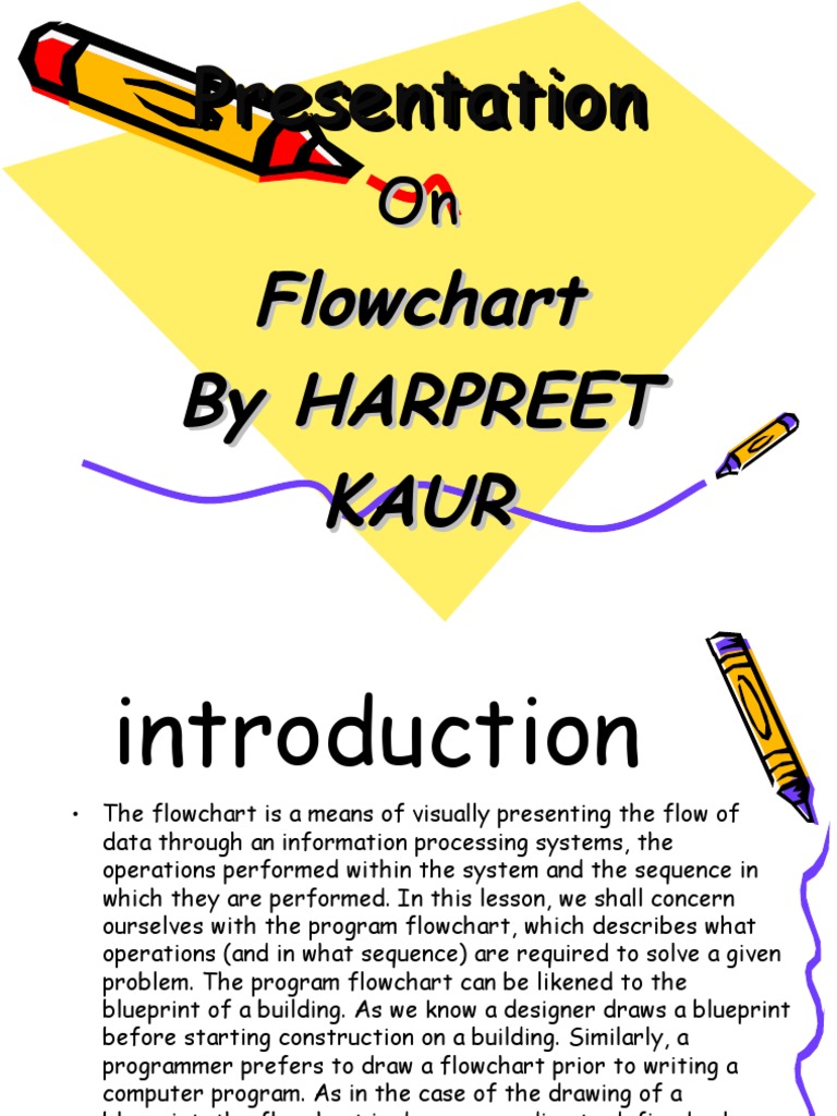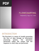 This document provides information on flowcharts, including their meaning, purpose, components and guidelines for creating them. A flowchart is a visual representation of the steps in a process or algorithm that uses standard symbols. It helps communicate program logic, facilitate analysis and coding, and serves as documentation. Key parts include start/end symbols, processing steps, inputs/outputs, decisions and connectors. Guidelines cover layout, using single flow lines and annotation. Advantages are communication, analysis, documentation and debugging support, while limitations include complexity for some problems and reproduction issues. Examples of flowcharts for calculating a sum and finding the largest of three numbers are also included.