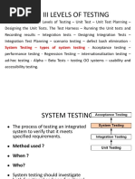 The document discusses different types of structural and functional system testing techniques. It provides details on stress testing, execution testing, recovery testing, operations testing, compliance testing, and security testing. The objectives and methods for each technique are described. Stress testing focuses on handling large volumes of transactions, while execution testing evaluates system performance. Recovery testing assesses the ability to restart operations after a failure.