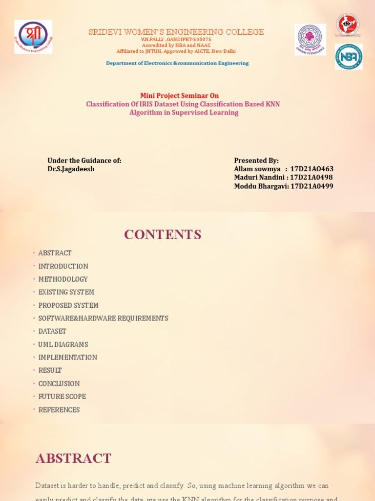 The document summarizes a mini project on classifying the iris dataset using the KNN classification algorithm. It discusses collecting the iris dataset, preprocessing the data, splitting it into training and test sets, building a KNN model, making predictions on the test set, and evaluating the results. It includes an abstract, introduction on supervised learning and the KNN algorithm, the methodology, existing system, proposed system, software and hardware requirements, the iris dataset, UML diagrams used, implementation steps, results showing accurate classification of the three iris species, and future work like using deep learning models.