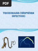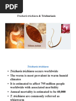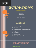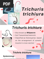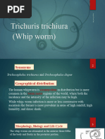 Trichuris trichiura, also known as the whipworm, is a soil-transmitted helminth. It inhabits the cecum and colon of infected individuals. Adult worms are 30-50mm long. Eggs are lemon-shaped and measure 50-54um by 23um. The life cycle involves ingestion of embryonated eggs from soil which hatch and penetrate the intestinal villi. Worms secrete proteins that allow them to embed in the intestinal wall. Heavy infections can cause dysentery, anemia, and rectal prolapse. Diagnosis is via stool examination. Treatment is mebendazole or albendazole. Prevention involves deworming, hygiene education,