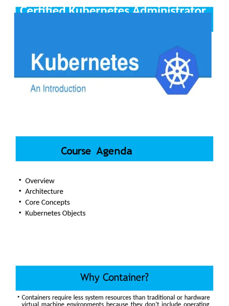 The document provides an overview of key concepts for the Certified Kubernetes Administrator certification, including: - Kubernetes allows for easy deployment of containerized applications across different operating systems and hardware. It automates processes like deployment, management, and scaling of containers. - The Kubernetes architecture includes a control plane (API server, scheduler, controller manager), data store (ETCD), nodes, pods, replica sets, deployments, services, and namespaces. - Key Kubernetes objects include pods, replica sets, deployments, services, and namespaces. Pods group related containers, replica sets ensure availability of pods, deployments facilitate rolling updates, services expose pods, and namespaces provide isolation.