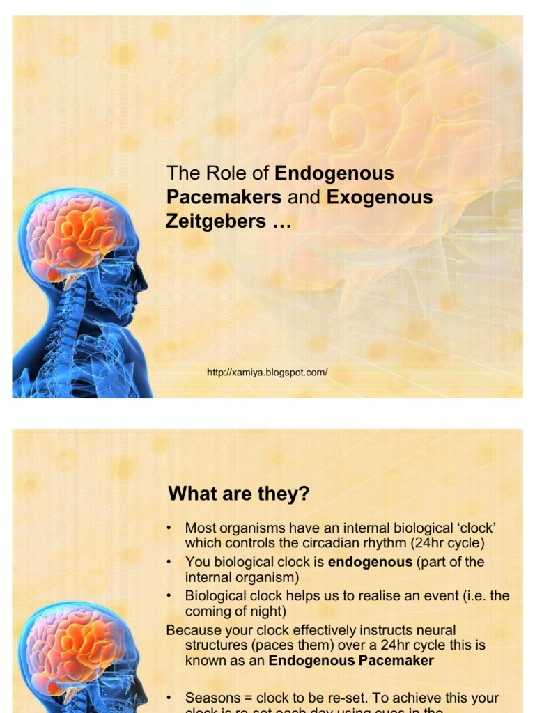 Most organisms have an internal biological clock which controls the circadian rhythm (24hr cycle) You biological clock is endogenous (part of the internal organism) Biological clock helps us to realise an event (i.e. the coming of night) Because your clock effectively instructs neural structures (paces them) over a 24hr cycle this is known as an Endogenous Pacemaker Seasons = clock to be re-set. To achieve this your clock is re-set each day using cues in the environment (cues are outside the body referred to as exogenous.) These exogenous cues (light, etc.) are known as zeitgebers. http://xamiya.blogspot.com/