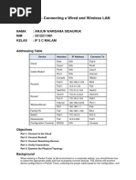 This document provides instructions for connecting a wired and wireless local area network (LAN) in Packet Tracer. It involves connecting various network devices including a cloud, routers, switches, wireless router, cable modem and PCs. The connections are examined both logically and physically. Key steps include connecting the cloud to routers, connecting routers to switches and PCs, verifying connectivity between devices, and examining the physical topology to understand how devices are connected and housed in different areas of the network.