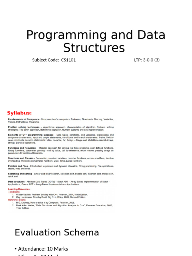 The document outlines the syllabus and evaluation schema for the Programming and Data Structures course (CS1101), detailing lab programs, operators, control statements, arrays, functions, and structures in C++. It includes specific assignments and examples for practical understanding of concepts like arithmetic, relational, and logical operators, as well as function overloading and recursion. Additionally, it emphasizes the importance of operator precedence and provides guidance on using conditional statements and arrays in programming.
