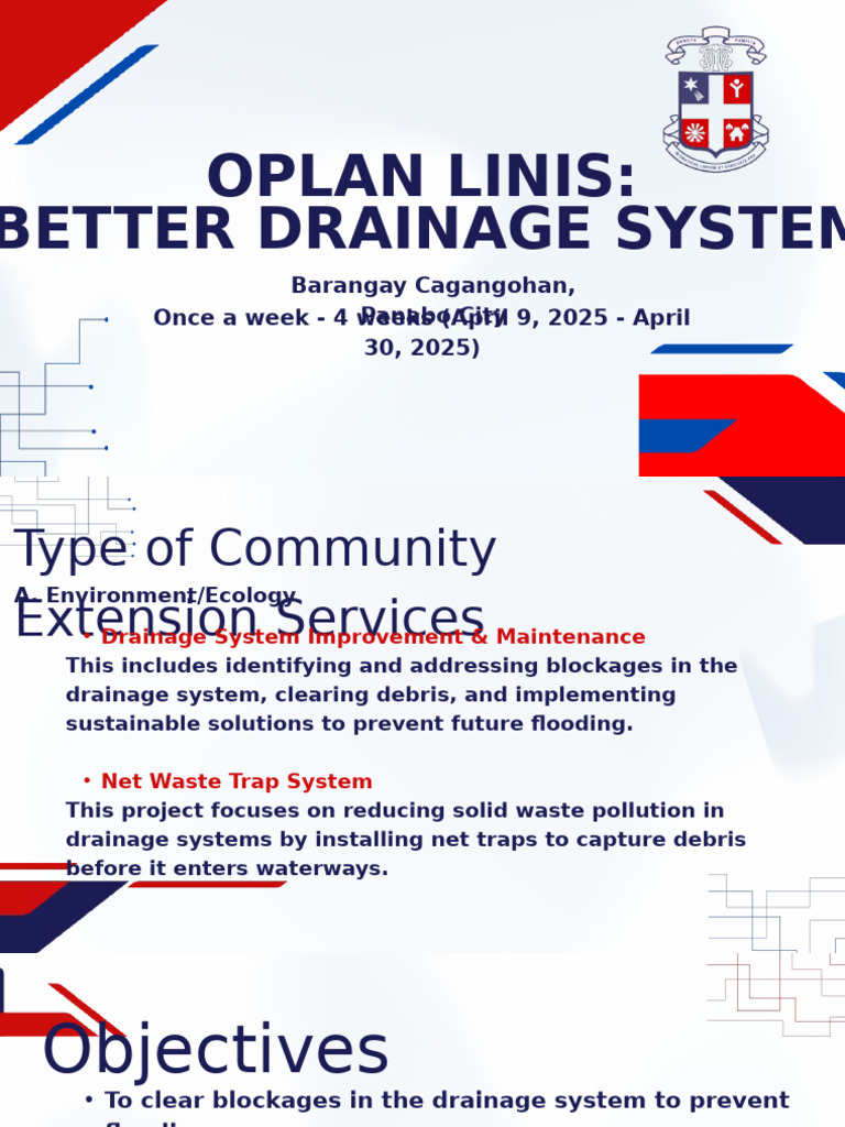 OPLAN LINIS aims to improve the drainage system in Barangay Cagangohan, Panabo, by addressing blockages, implementing a Net Waste Trap System, and raising community awareness. The project will be monitored weekly and focuses on sustainable solutions to prevent flooding and health risks from stagnant water. Plans for sustainability include regular maintenance, community involvement, and educational campaigns on waste disposal and drainage care.