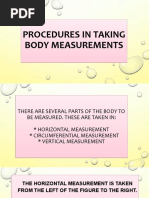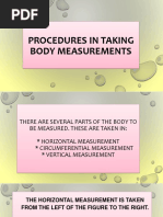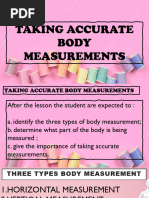 The document outlines essential rules and techniques for taking accurate body measurements, which are crucial in fashion design for ensuring proper garment fit. It emphasizes the importance of using a non-stretch tape measure, measuring specific body points, and maintaining consistency in measurement techniques. Various measurement types, including horizontal, vertical, and circumferential, are detailed to guide the measurement process.