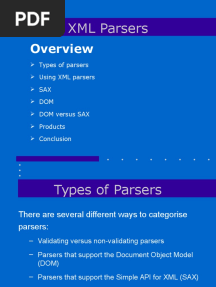 XML Parsers: SAX vs DOM GuidePDFXML Parsers: SAX vs DOM GuideAdded by Muthumanikandan0 ratingsfunction kt(e,t){var n=e+t;return n<=0?0:Math.round(e/n*100)}% found this document usefulSave XML Parsers: SAX vs DOM Guide for later