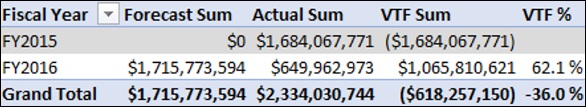 Similarly, for Fiscal Quarter FY2016-Q2, VTB Rate is $1,281,467,662, and VTB Volume is $-1,210,710,978. If you add VTB Rate and VTB Volume, you will get $70,756,678, which is the VTB Sum value shown in the PivotTable.