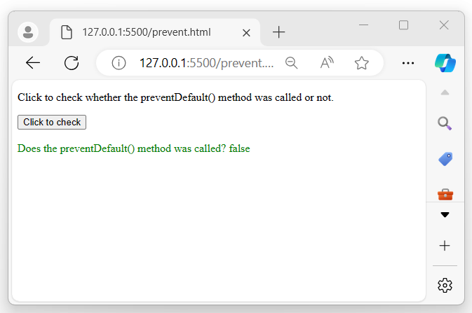If the preventDefault() method is not used in the event object, it will return 'false' −