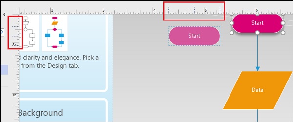 When you place shapes onto the canvas, you will see guides that help you align the shapes with respect to the objects already on the canvas. You also have a ruler on the top and left of the canvas. This gives a sense of perspective and lets you create perfectly aligned diagrams.