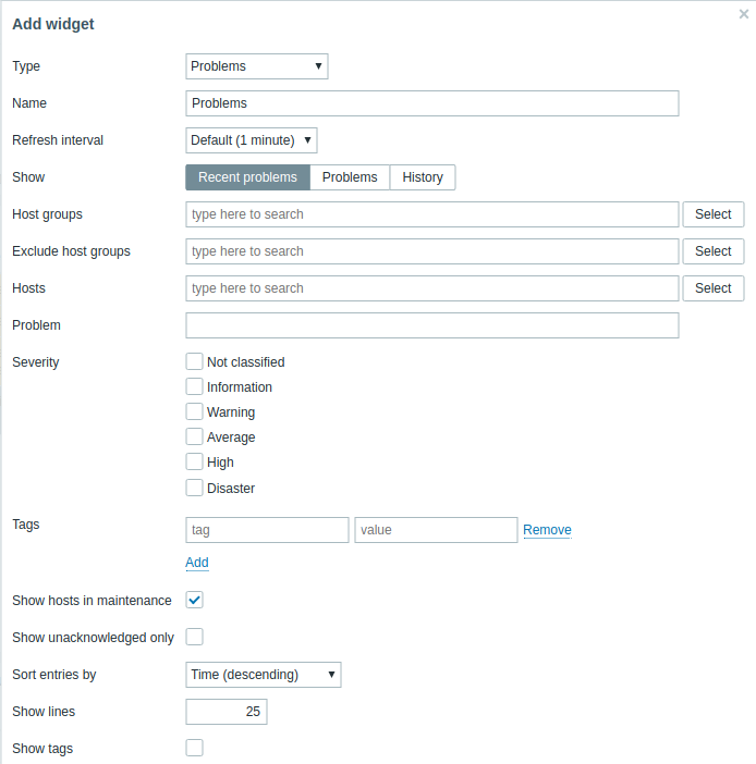 | Теги | Укажите имя и значение тега событий, чтобы ограничить количество отображаемых проблем. Для добавления нескольких значений и имен тегов, нажмите на Добавить. |