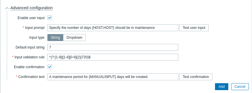 | Comando | Ingrese el comando IPMI. La compatibilidad con macros depende del alcance del script (consulte Alcance más arriba). Se admiten macros de usuario personalizadas. |