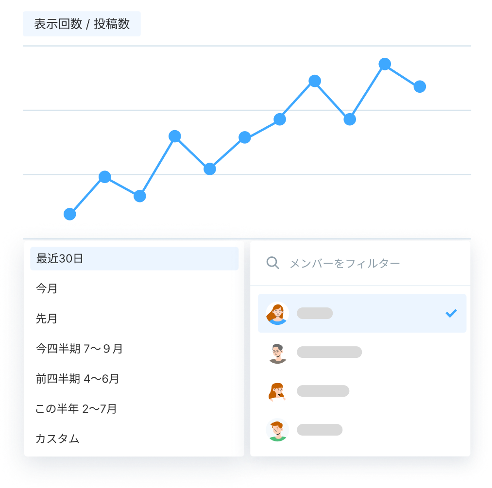 Publication全体や個人について、自由に期間設定して投稿数やPVの把握が可能。csvダウンロードもできるため分析用途にも使えます。